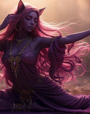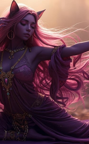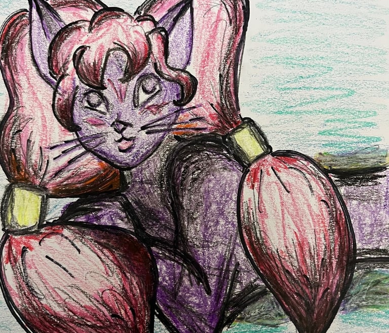 Bakeneko Bastet, also known as BB Cat, is a vibrant purple and pink celestial being and whispering guardian guiding you through your mind, body, and spirit journeys to realize the best you.